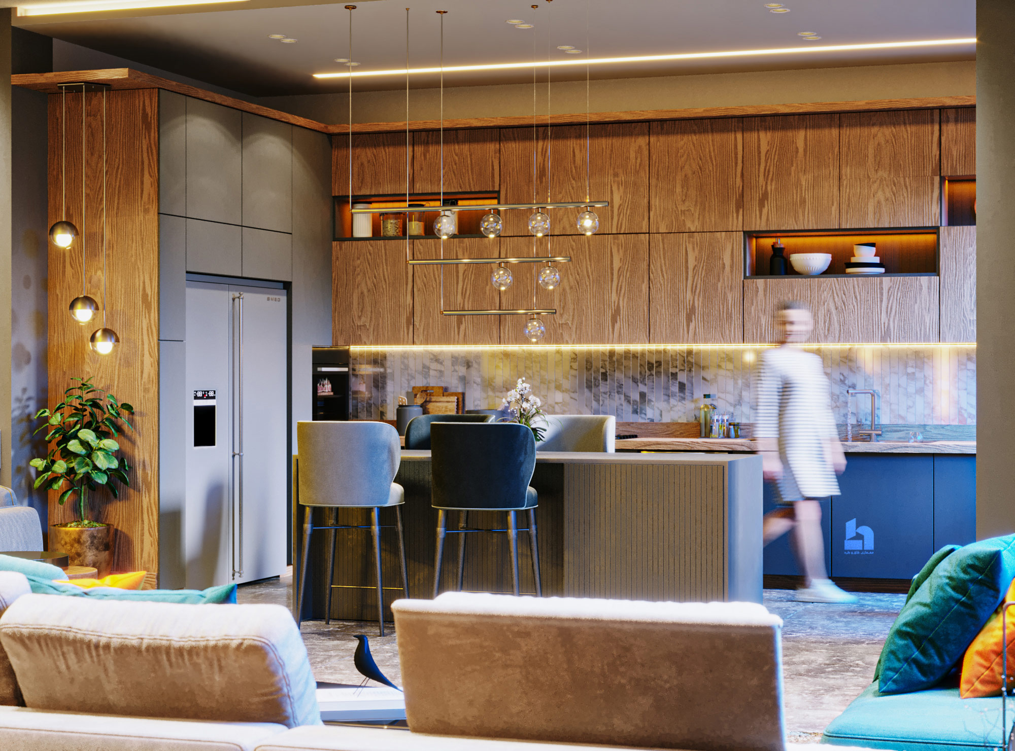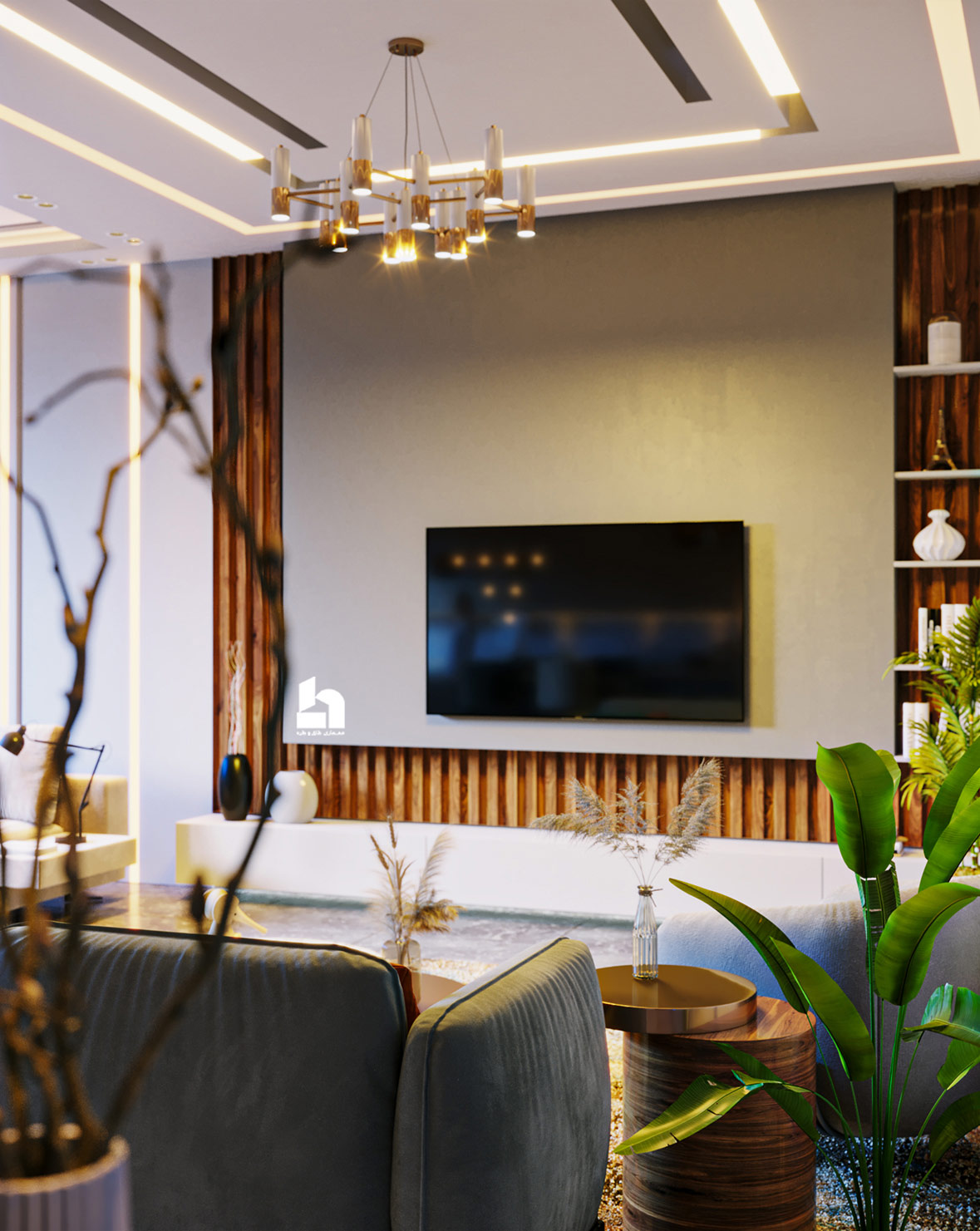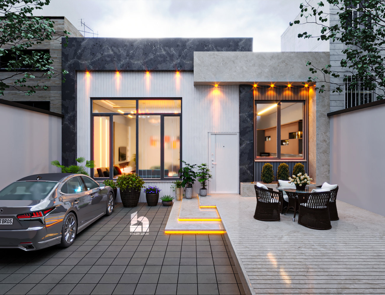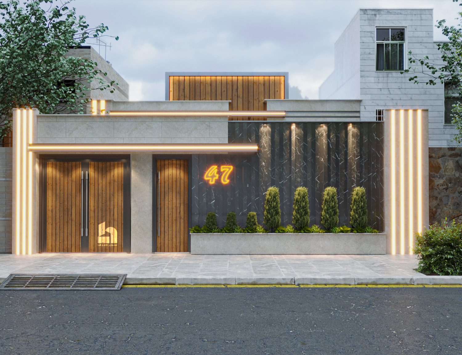 نمای اصلی ساختمان با ترکیب دو متریال سنگ و چوب طراحی شد، به گونه ای که در ورودی واحد با چوب از بقیه بخش های نما تفکیک شد و استفاده از لاین های نوری کمکی بود به جلوه بخشیدن به سایر قسمت های نما که سنگ کرم و مشکی در نظر گرفته شده بود.