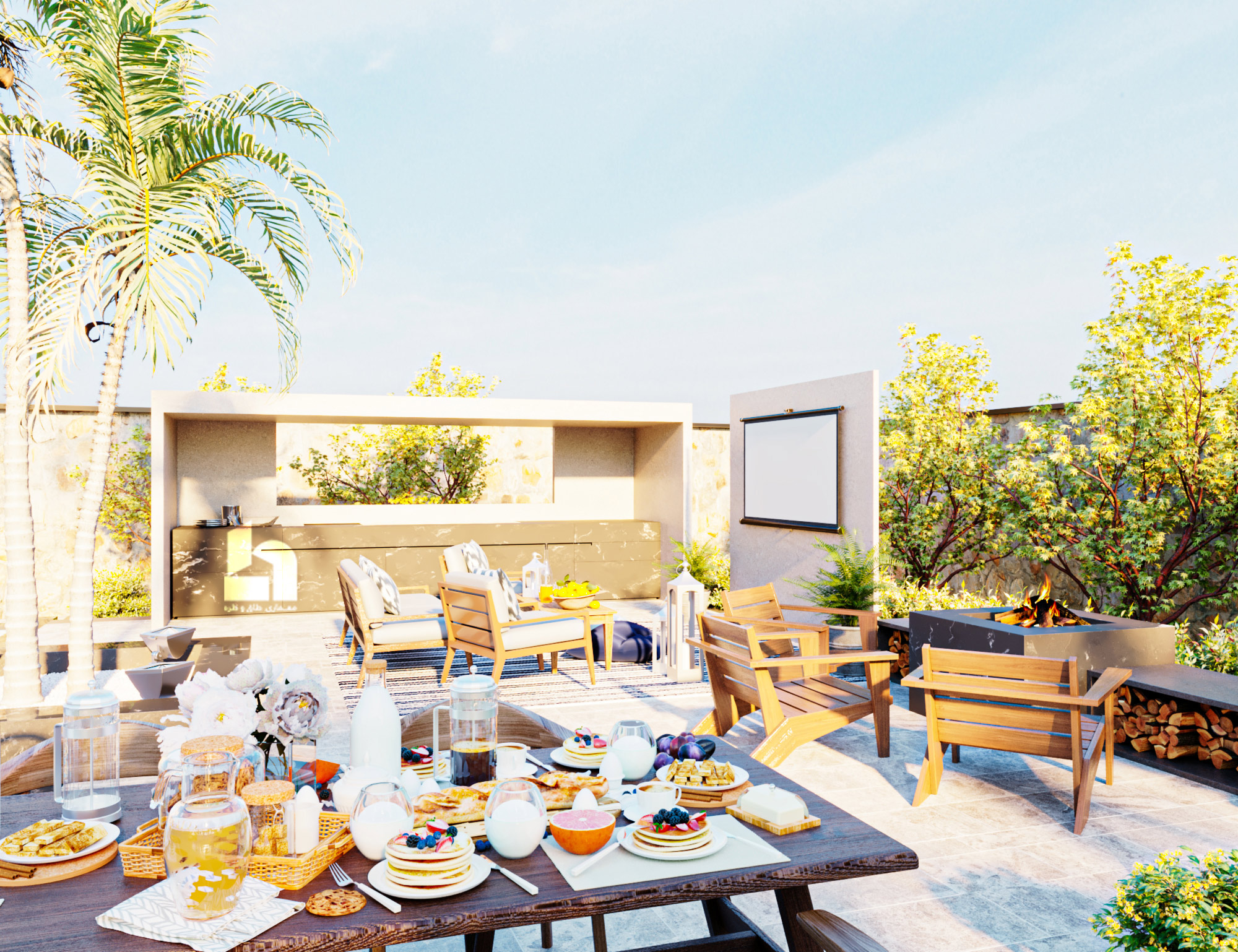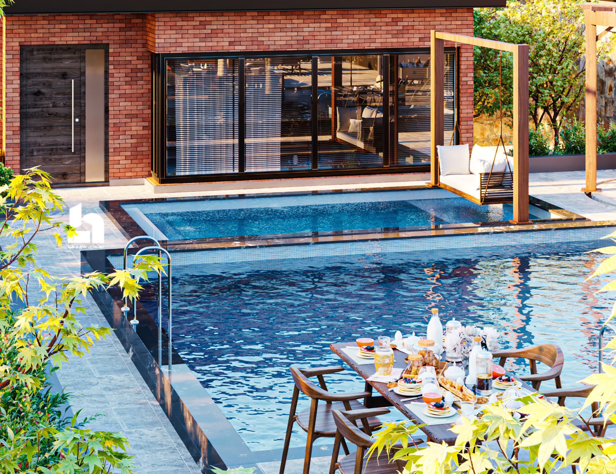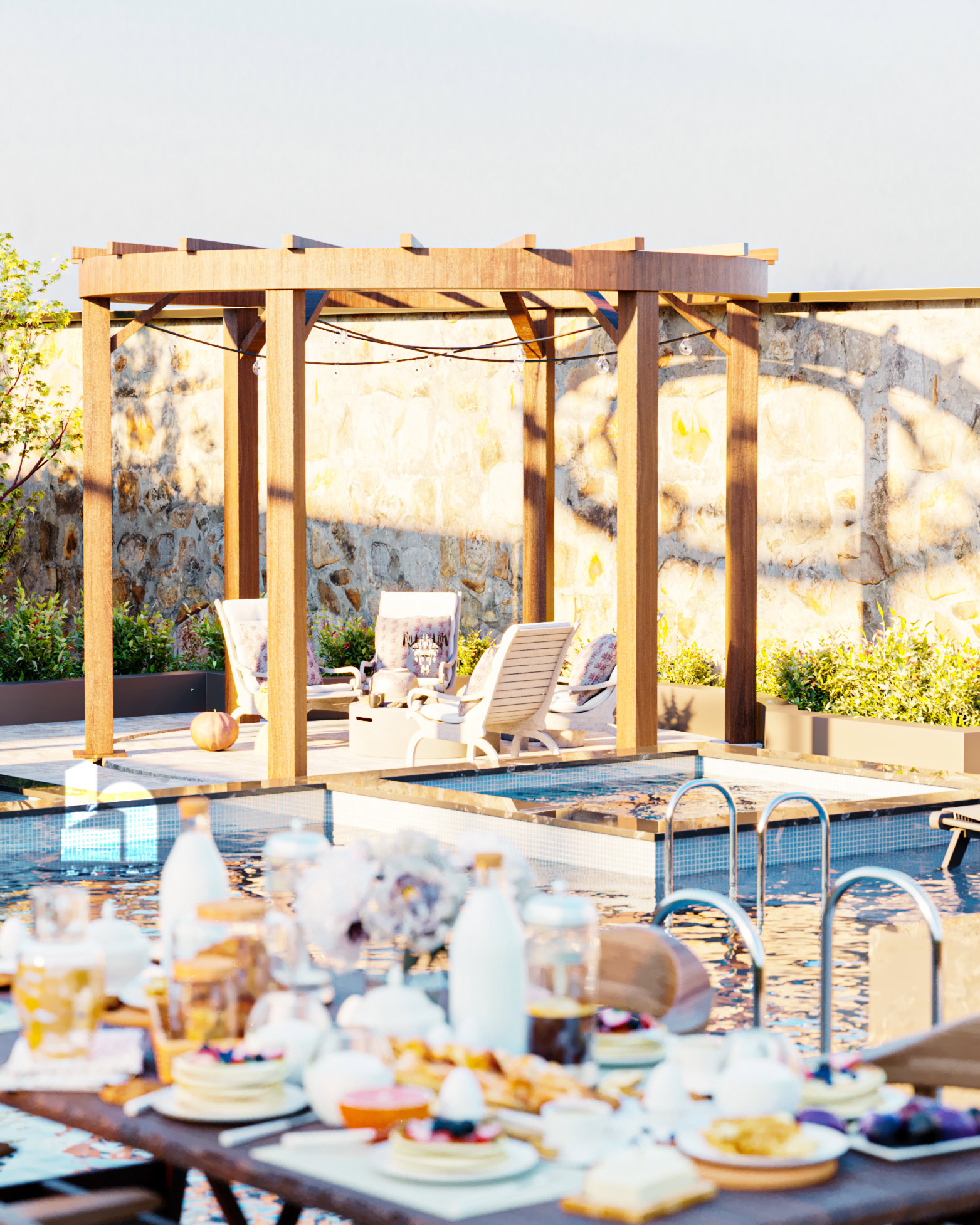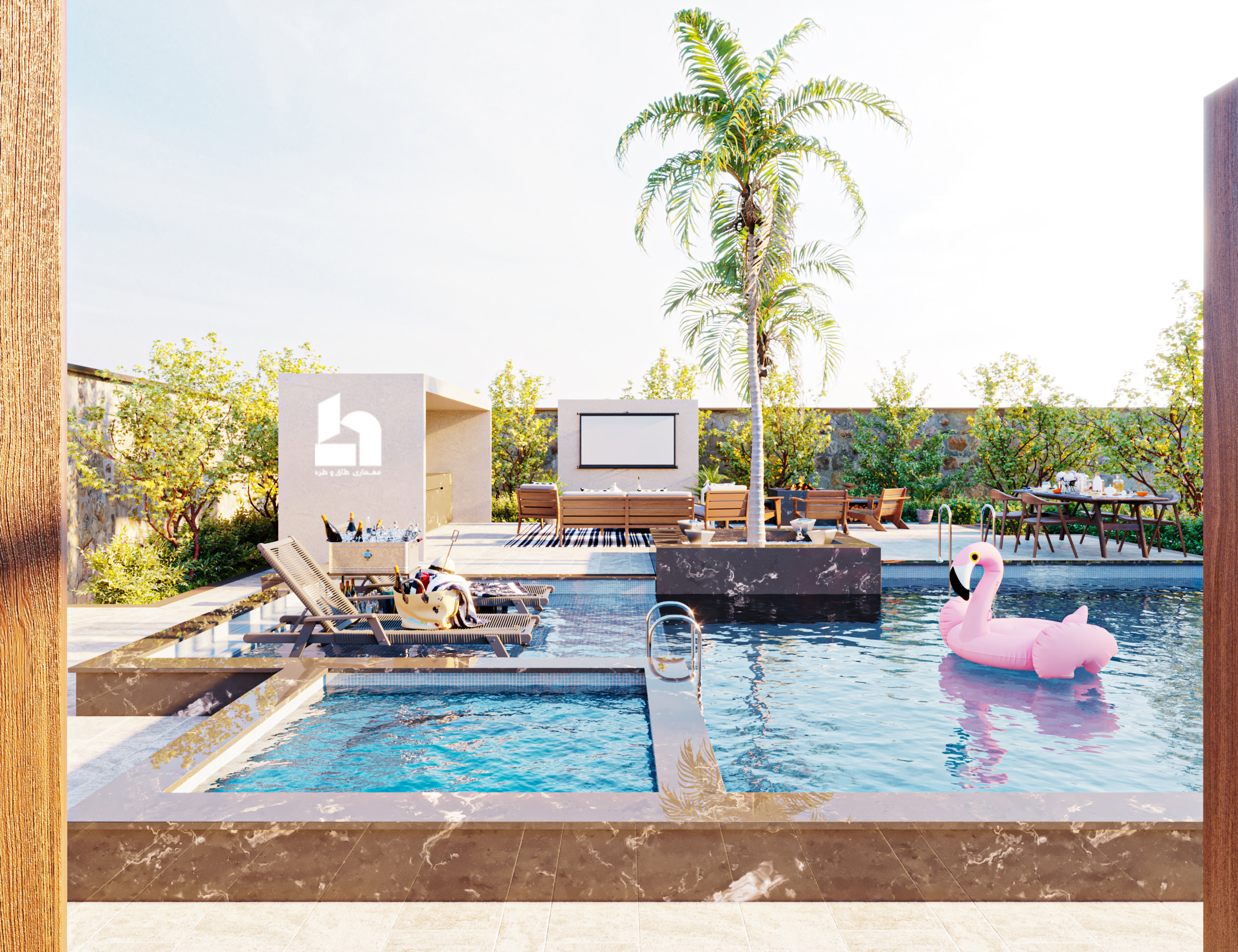 استخر شنا، استخر بازی کودکان، در نظر گرفتن تاب بر روی استخر کم عمق، در جانمایی میز صبحانه در جوار استخر و نشیمن های متعدد از ایده های محوطه سازی در این باغ بود.سال